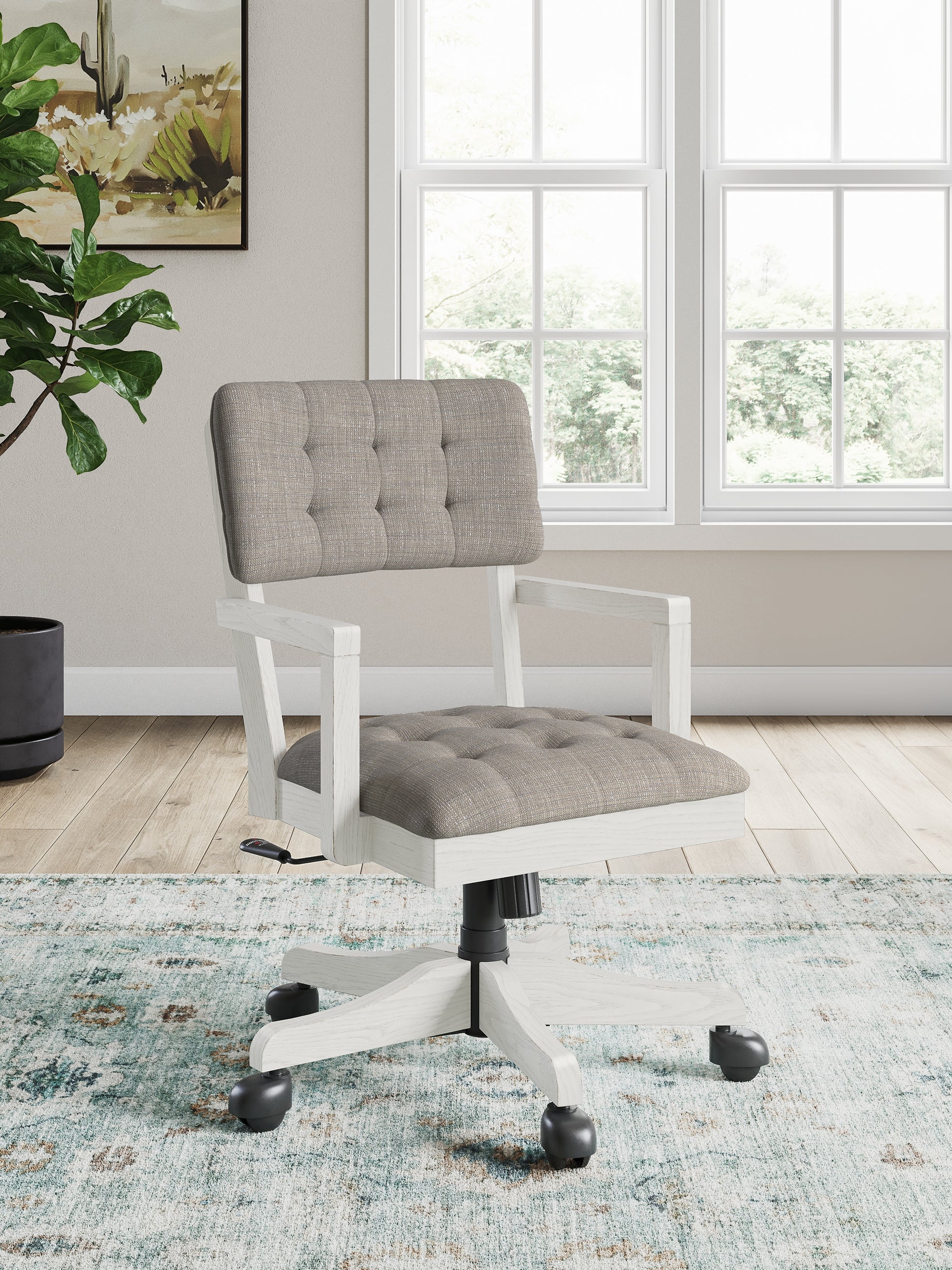 This home office desk chair is sure to impress when it’s time to study or work from home. With its antiqued white finish, cushioned seat and back covered in tufted light gray upholstery, modern farmhouse-style workstations have never been so fashionable. The adjustable seat allows you to find your sweet spot, while casters provide easy mobility. All that’s missing is you.